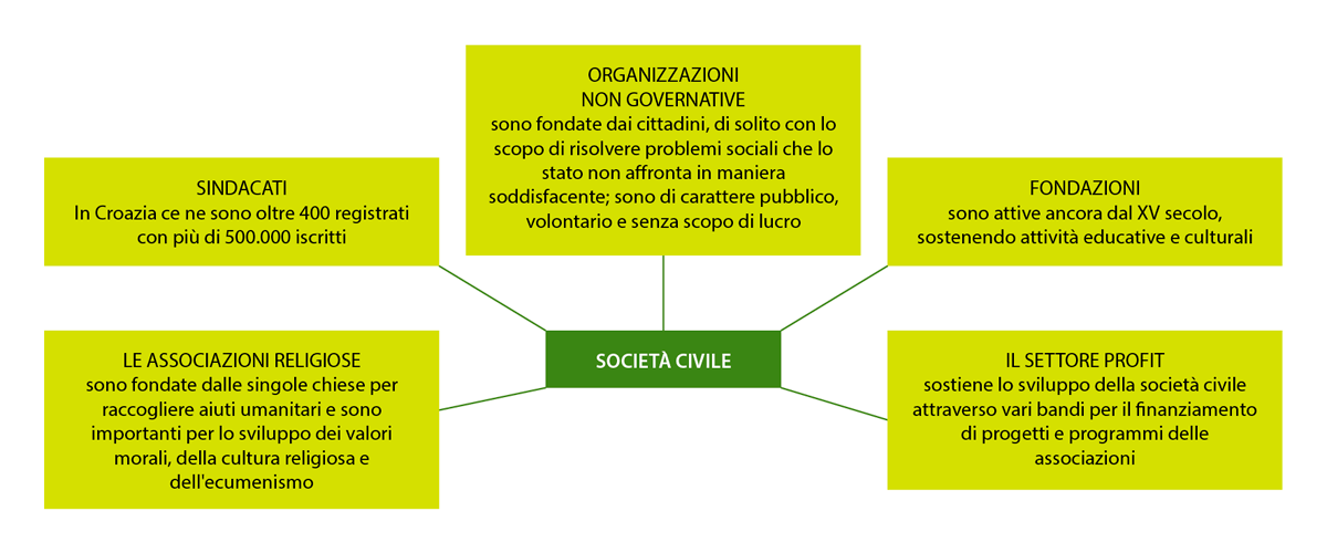 A causa dell'aggressione bellica contro la Croazia e delle sfavorevoli condizioni economiche, politiche e culturali da essa causate, lo sviluppo della società civile all'inizio degli anni '90 è stato lento, per cui potrà essere monitorato sistematicamente solo dopo l'adozione della Legge sulle associazioni nel 1997 e l'istituzione della Fondazione nazionale per lo sviluppo della società civile nel 2003.