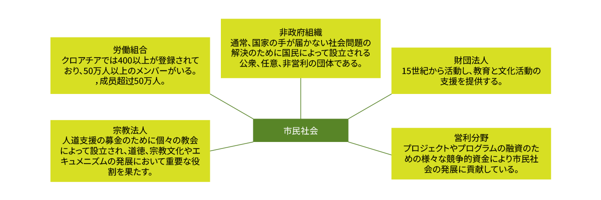 クロアチアの、これまでの市民社会の組織と発展の多くは、カトリック教会や資産家の慈善活動と関係しており、中世には既に基金や兄弟会の形態も存在していた。そのような活動は社会主義の時代の1945年–1990年の間には存在しなかった。