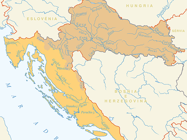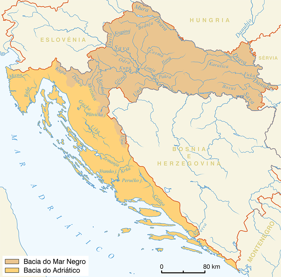 Cerca de 62% do território coberto por uma ampla rede fluvial pertence à bacia do Mar Negro. Esta bacia também inclui os maiores rios croatas, o Sava (562 km) e o Drava (505 km) que, como o Danúbio, no qual desaguam, são em grande parte rios de fronteira.