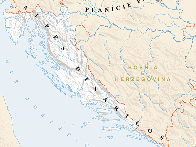 A área montanhosa é seguida pela área costeira. A norte, inclui a península da Ístria e, a sul a de Rijeka, um litoral estreito com ilhas, delimitado por altas montanhas (Velebit). A parte sul da costa coincide com a região histórica da Dalmácia. A principal característica desta região é o domínio do relevo cársico. Trata-se da região caracterizada por uma zonalidade longitudinal e uma divisão em ilhas, um cinturão costeiro e um interior montanhoso (Zagora). A zona costeira é relativamente estreita, delimitada por encostas íngremes de montanhas em direção ao interior. É mais larga e mais baixa nas zonas de flysch de Ravni kotari, no norte, em redor de Kaštela na parte central e no delta do rio Neretva, na parte sul. No interior encontra-se Dalmatinska zagora, uma zona montanhosa com vários campos cársticos extensos (Sinjsko, Imotsko).